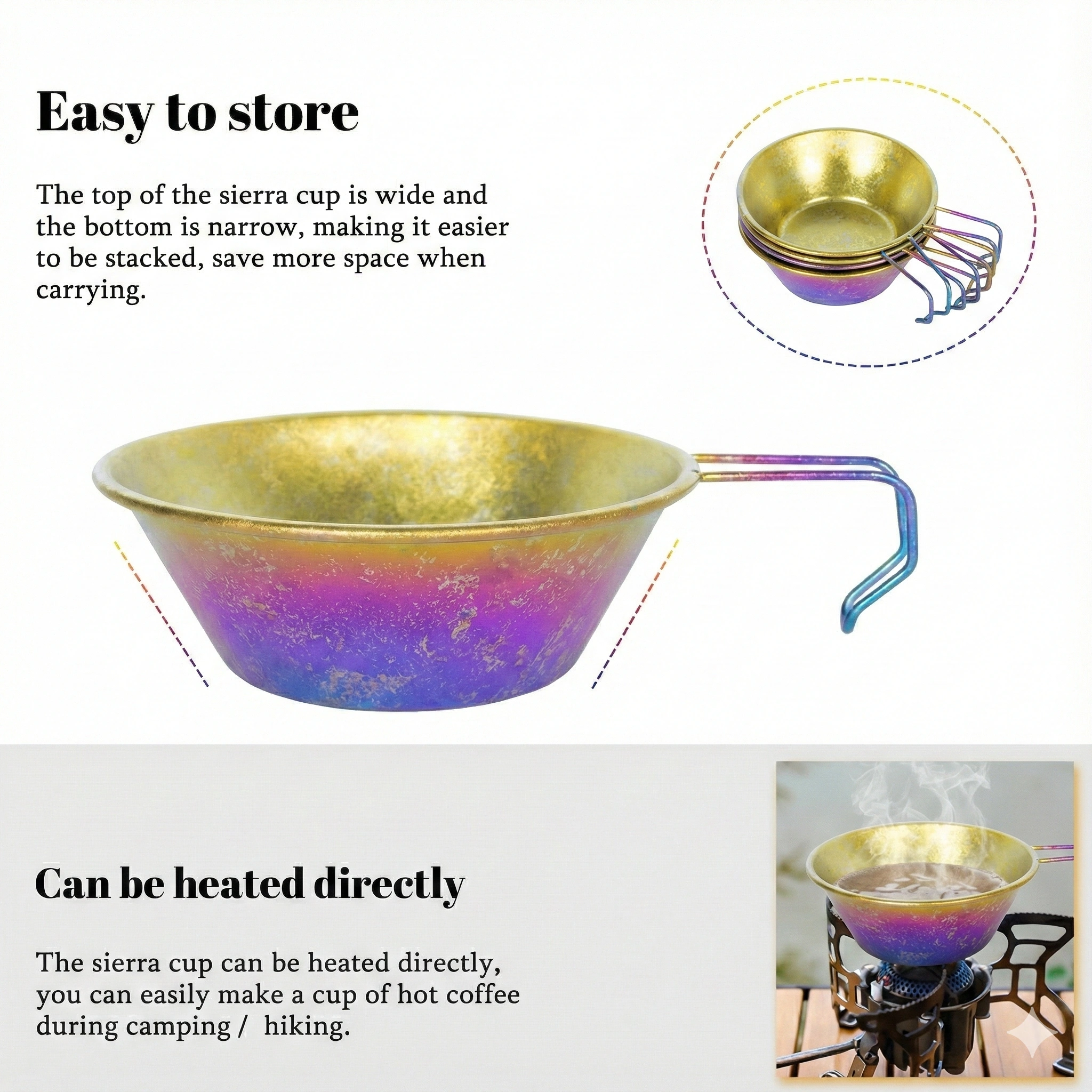| Heating | Direct flame capable | Versatility | Boil water, warm soup, or cook small portions |
