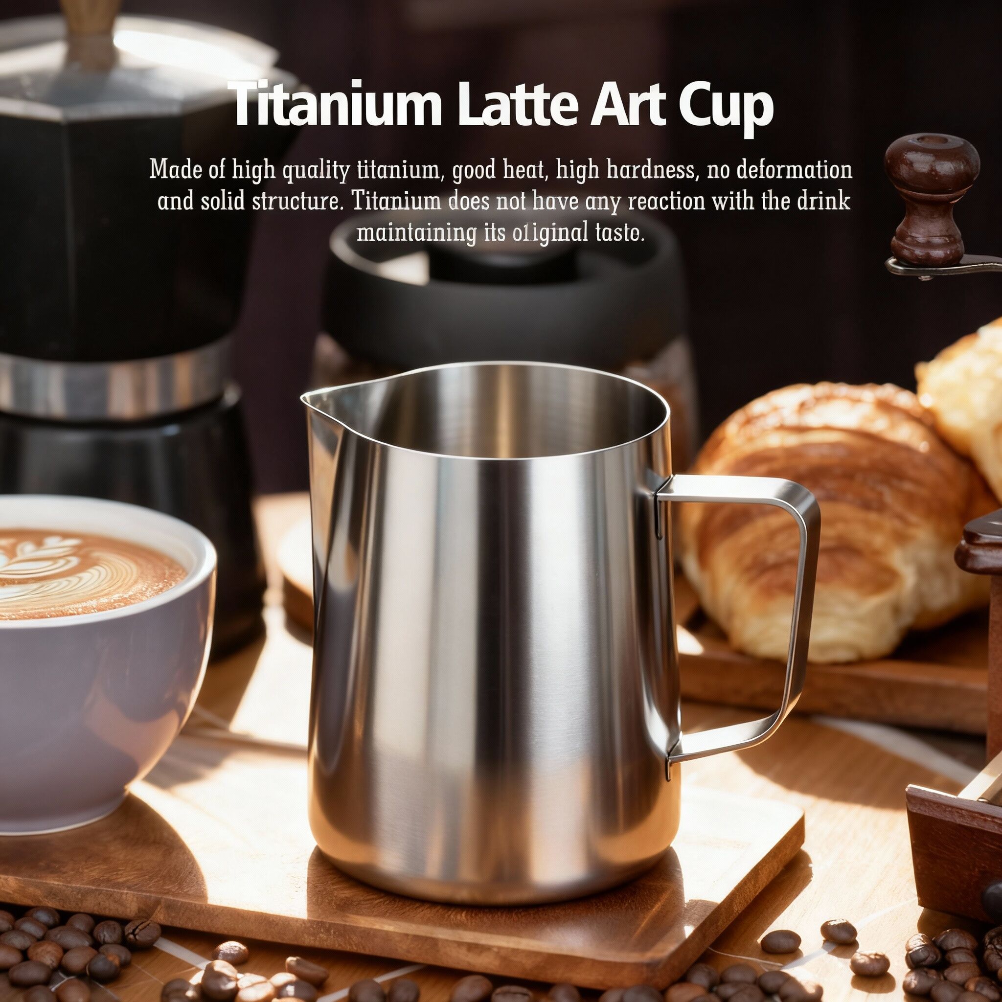 Designed for professional steam-wand performance and precise latte art lines. The inert, uncoated titanium interior preserves milk sweetness and micro-foam integrity, with thin-wall responsiveness for fast temperature feedback.